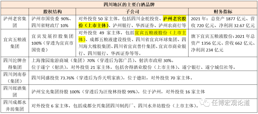 从股权结构及市场体量来看,位于泸州的泸州老窖和位于宜宾地区的五粮液是四川地区的白酒主品牌,在四川白酒行业中占有重要地位。而深化牌舍得集团、四川剑南春集团、郎酒集团、水井坊集团的政府痕迹会比较少,体量也更小。