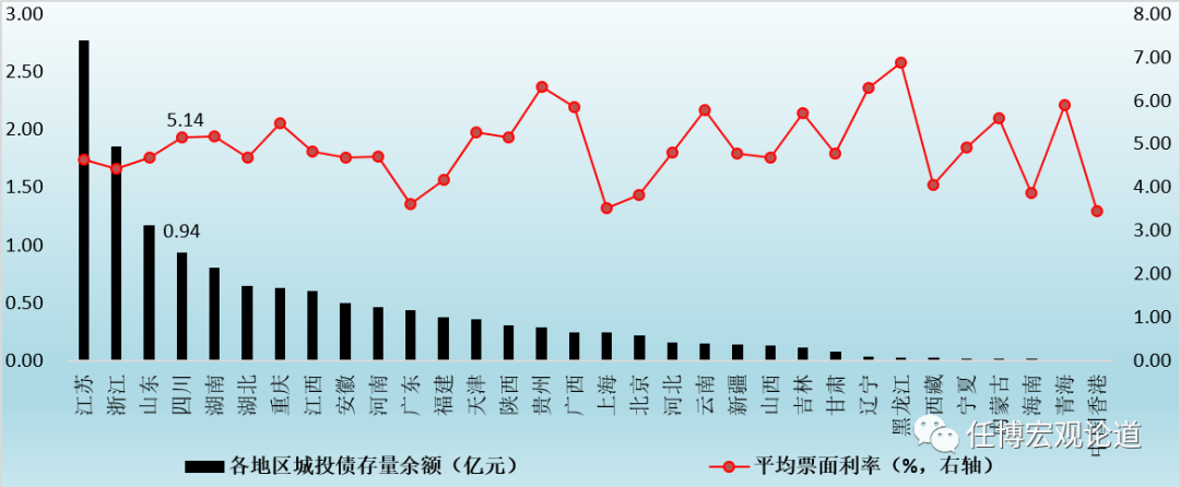 若从城投债的成本来看,目前四川地区的存量城投债票面利率平均为5.14%,位居全国第13位,低于黑龙江、贵州、辽宁、青海、广西、云南、吉林、内蒙古、重庆、天津、湖南、陕西等地。