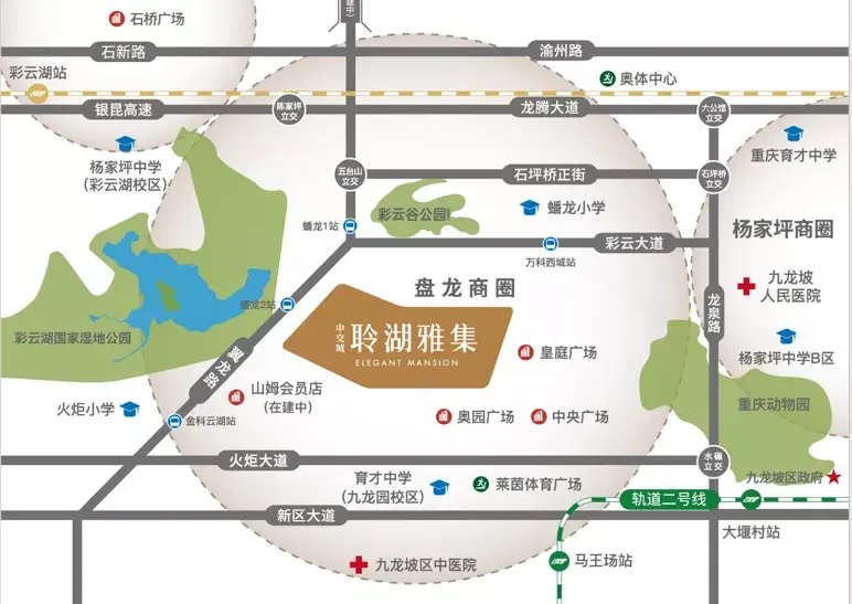 教育迭新,近几年,彩云湖片区教育配套进一步完善,现已聚集重庆蟠龙小学、彩云湖小学、重庆79中、杨家坪中学B区(九龙坡第一所示范性初中,重庆市文明礼仪示范学校)、重庆育才成功学校鲁能校区等学校,可全面覆盖片区域内适龄学童。