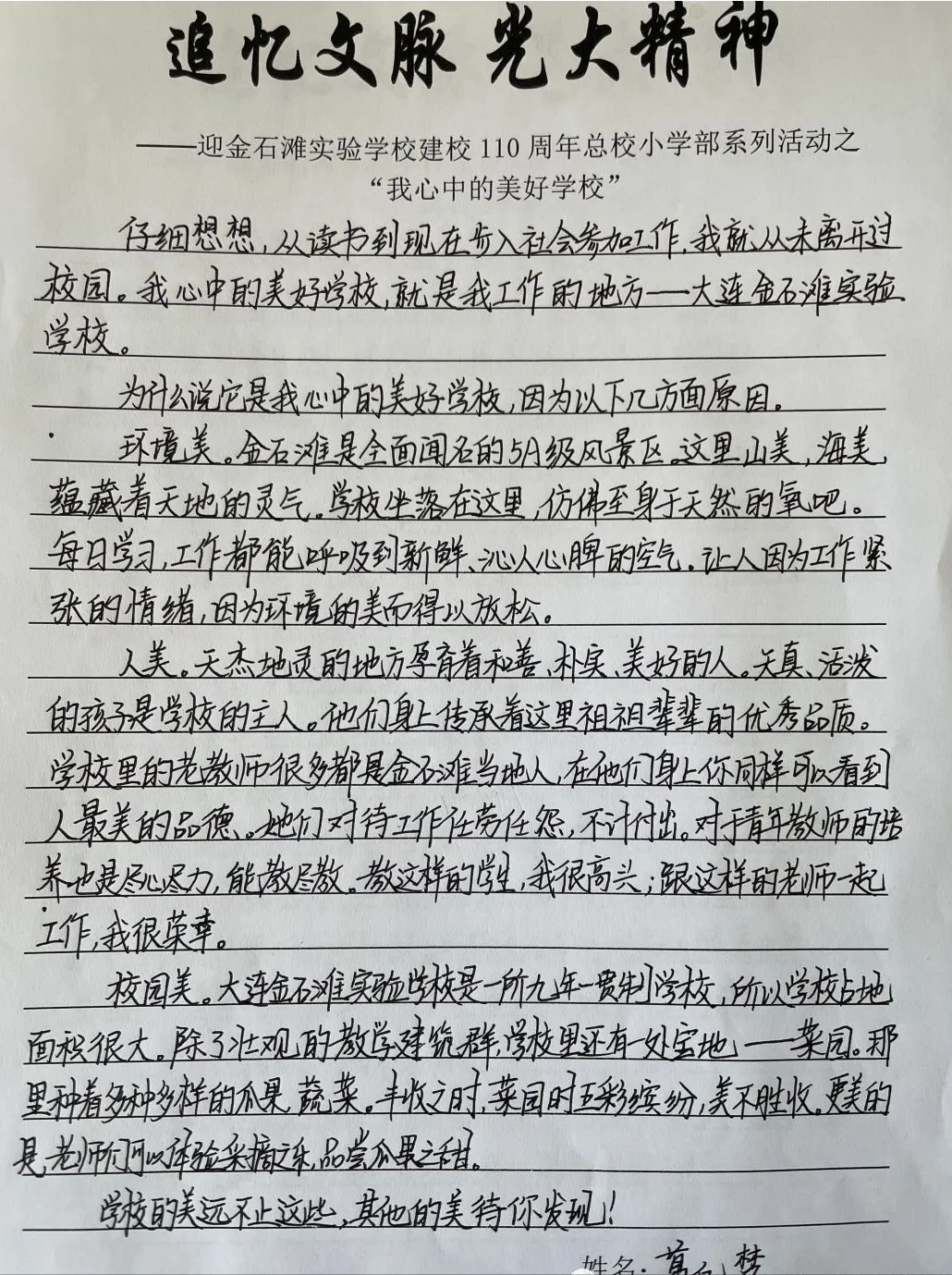 老教师们追忆往昔,通过一些亲身经历和教育故事,让青年教师更好地了解了金石滩实验学校的历史传承与文化脉络。会后每位年轻教师都根据本次座谈会的内容和感受写出了“我心中的美好学校”。