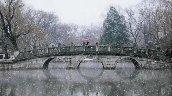 (校友桥位于北大西门和办公楼之间,为燕大校友1926年捐建而成。这座三孔圆券石拱桥,中券正上有镇水兽,其名为“蚣蝮”,为龙九子之一。桥上栏板饰云纹,两侧各12望柱,均为正方形立柱,柱头亦近似方形,阴刻有如意纹石桥两端以传统常见的抱鼓石收束。长15米、宽4米,正在燕园东西主轴线上,横跨方池碧波,体态优雅,外形秀丽。驻足桥上左右有栏杆可倚,春可观鱼,冬可赏雪。)