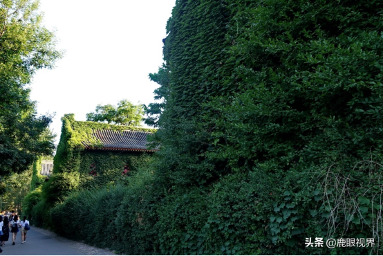 (北京大学的一些小院很有味道,绿植爬满了石头砌成的墙体,夕阳从院子的红色的木门框泻出,将太阳变成了橘红色。)