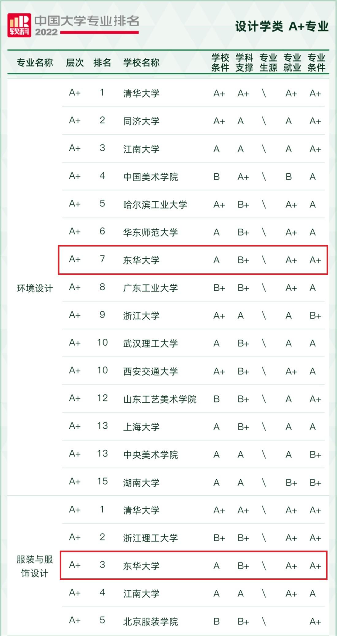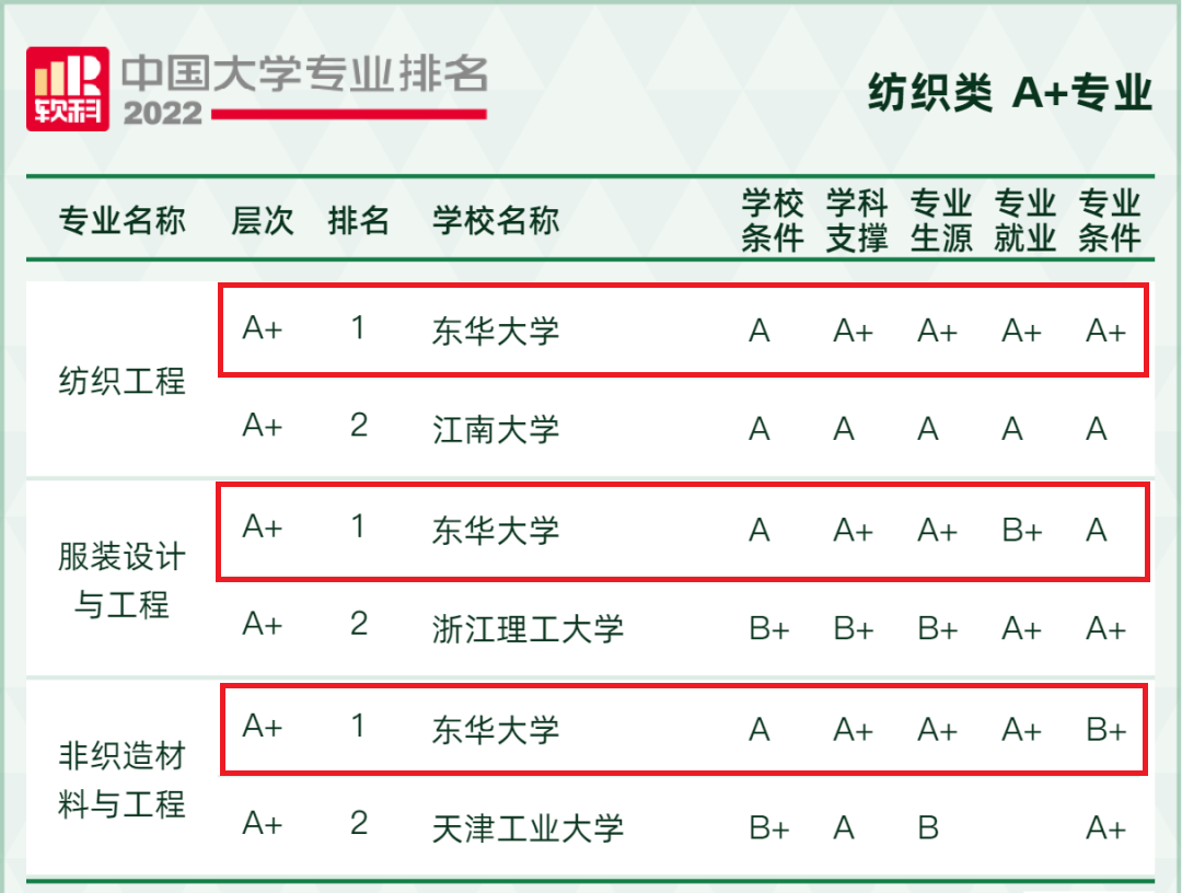 在本年度的排名中,东华大学共有58个专业上榜,其中28个专业获评A级以上。同时,学校继续在纺织类专业排名中包揽全部第一。学校入选“A+”等级的五个专业分别为纺织工程(全国第1位)、服装设计与工程(全国第1位)、非织造材料与工程(全国第1位)、服装与服饰设计(全国第3位)、环境设计(全国第7位)。