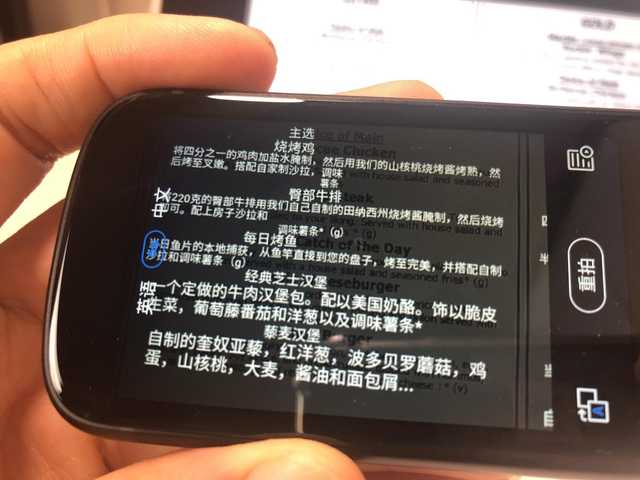 另外,在国外点餐也是拍照翻译的重要使用场景。经常羡慕一些旅游博主,在各个国家逛吃逛吃,怎么人家到了当地就能点到招牌菜或者正宗的美食?那得是语言能力多强啊?或者有当地导游带着才行吧?其实只需要翻译机拍张照片就可以了。讯飞翻译机3.0的拍照翻译结果可以触摸放大,把翻译结果调到看着舒服的大小,想吃烤鸡还是轻食汉堡,研究一下再做决定呗。