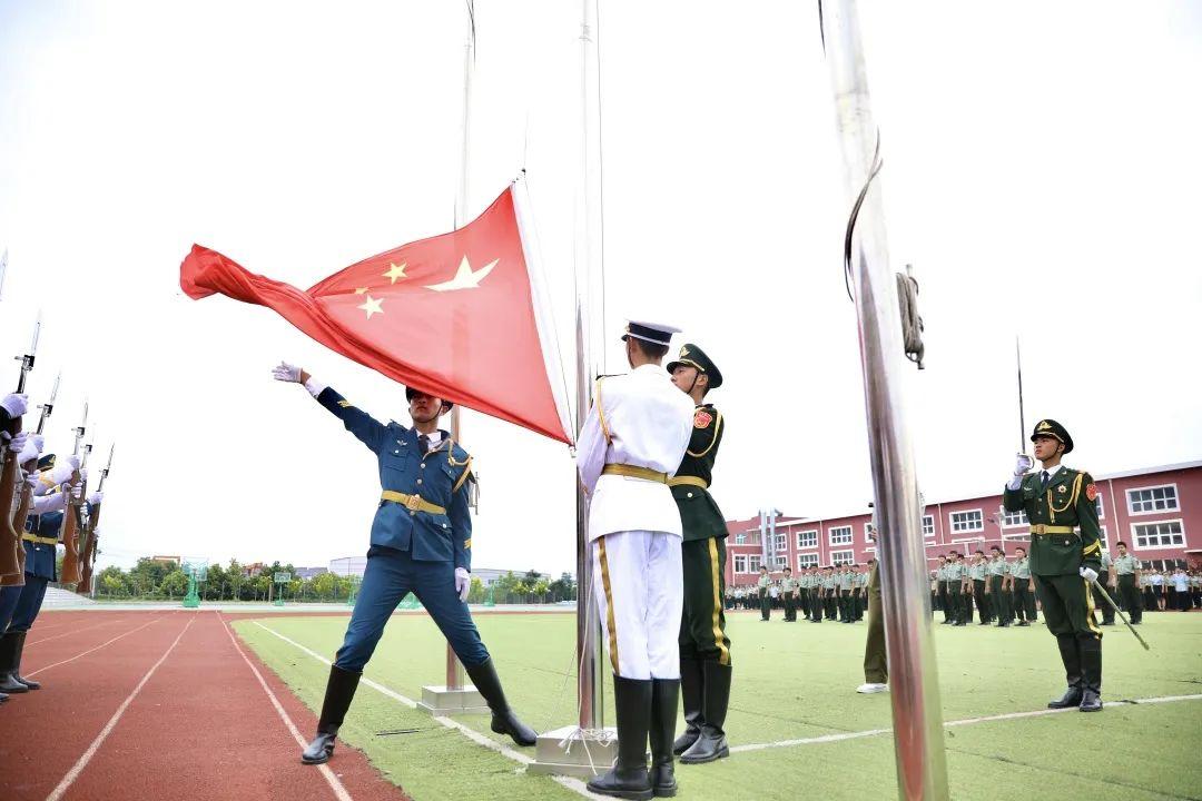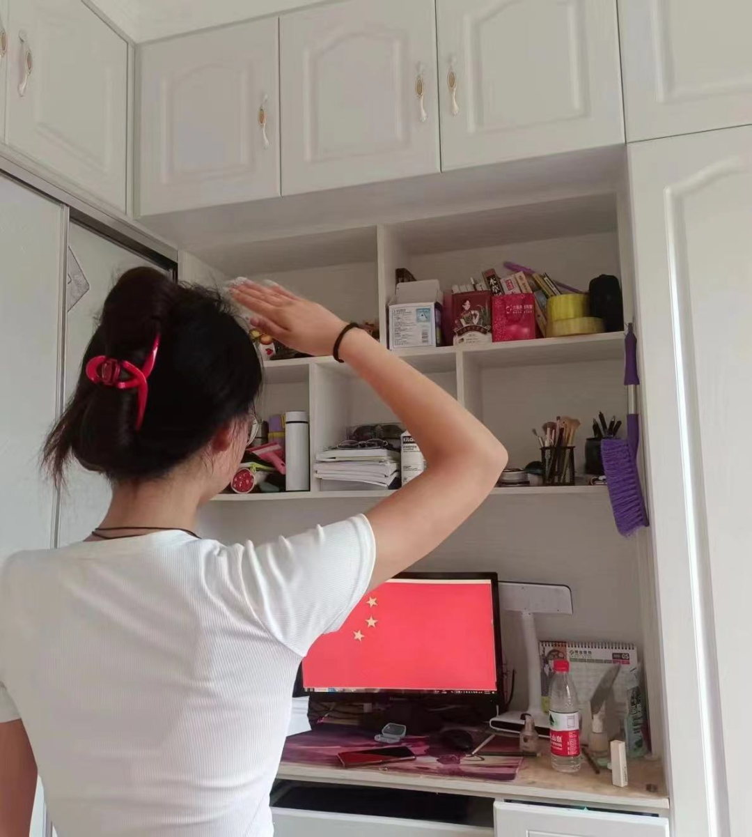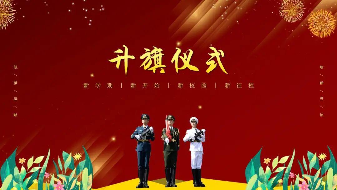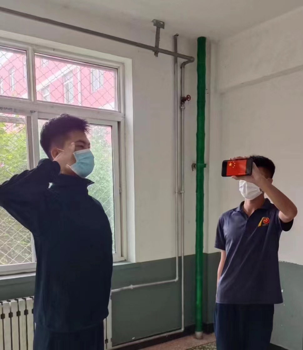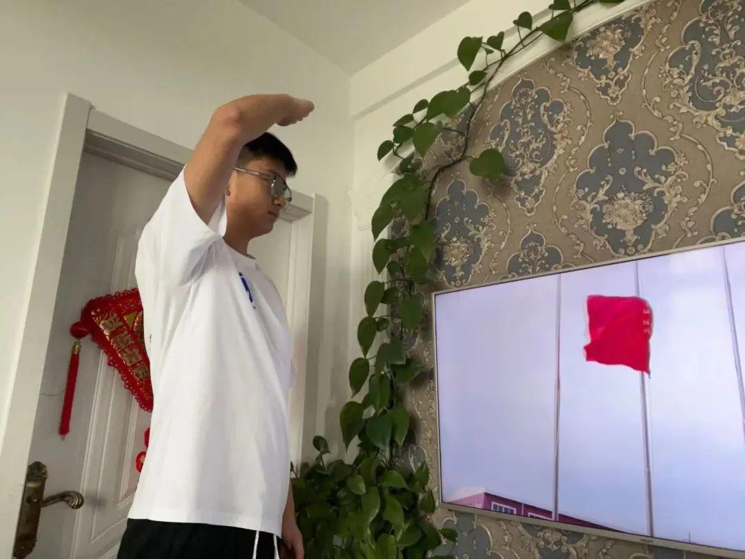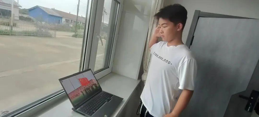 伴随着国歌的雄壮旋律,五星红旗徐徐上升,师生全体起立,在屏幕前行注目礼,目视着国旗的方向,鲜艳的五星红旗在云端迎风飘扬。