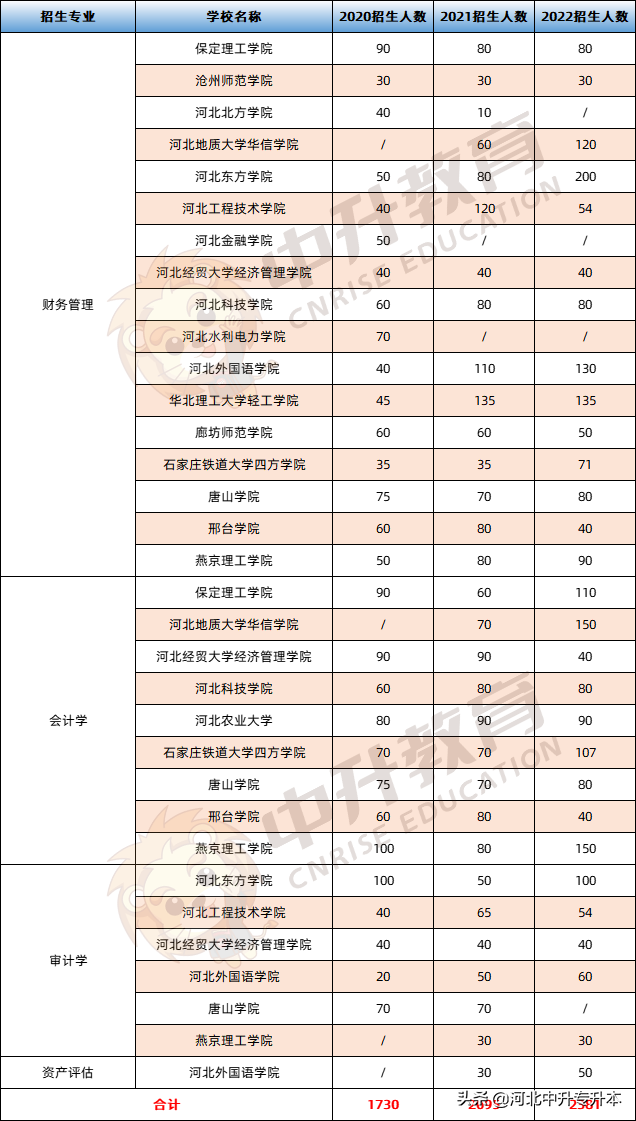 整体来看,会计学招生院校较为稳定,基本一样;财务管理2022年河北北方学院、河北水利电力学院2所公办院校取消招录;审计学2022年唐山学院取消招录。