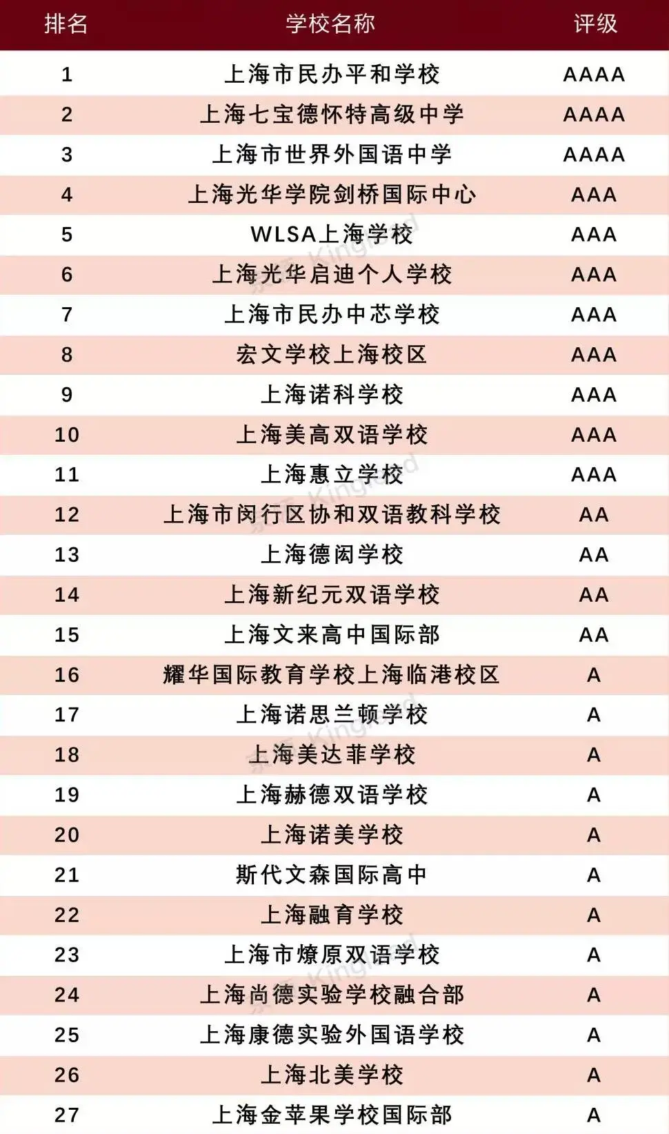 在本次榜单中,上海市共有27所国际学校上榜,上榜学校数量位列榜首。在上榜学校中,位列上海市榜单前三名的国际学校分别为:上海市民办平和学校、上海七宝德怀特高级中学及上海市世界外国语中学,三所学校均获“4A”评级。