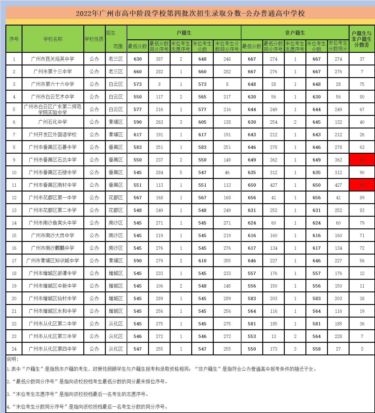公办普通高中学校第四批次录取分数线最高的是广州市第十三中学,户籍生660分,非户籍生667分;第四批次户籍生最低的录取分数线是545分,非户籍生分数线最低的是广州市从化区第四中学550分,只比户籍生多3分,也是第四批招生学校中户籍生与非户籍生分差最小的学校。