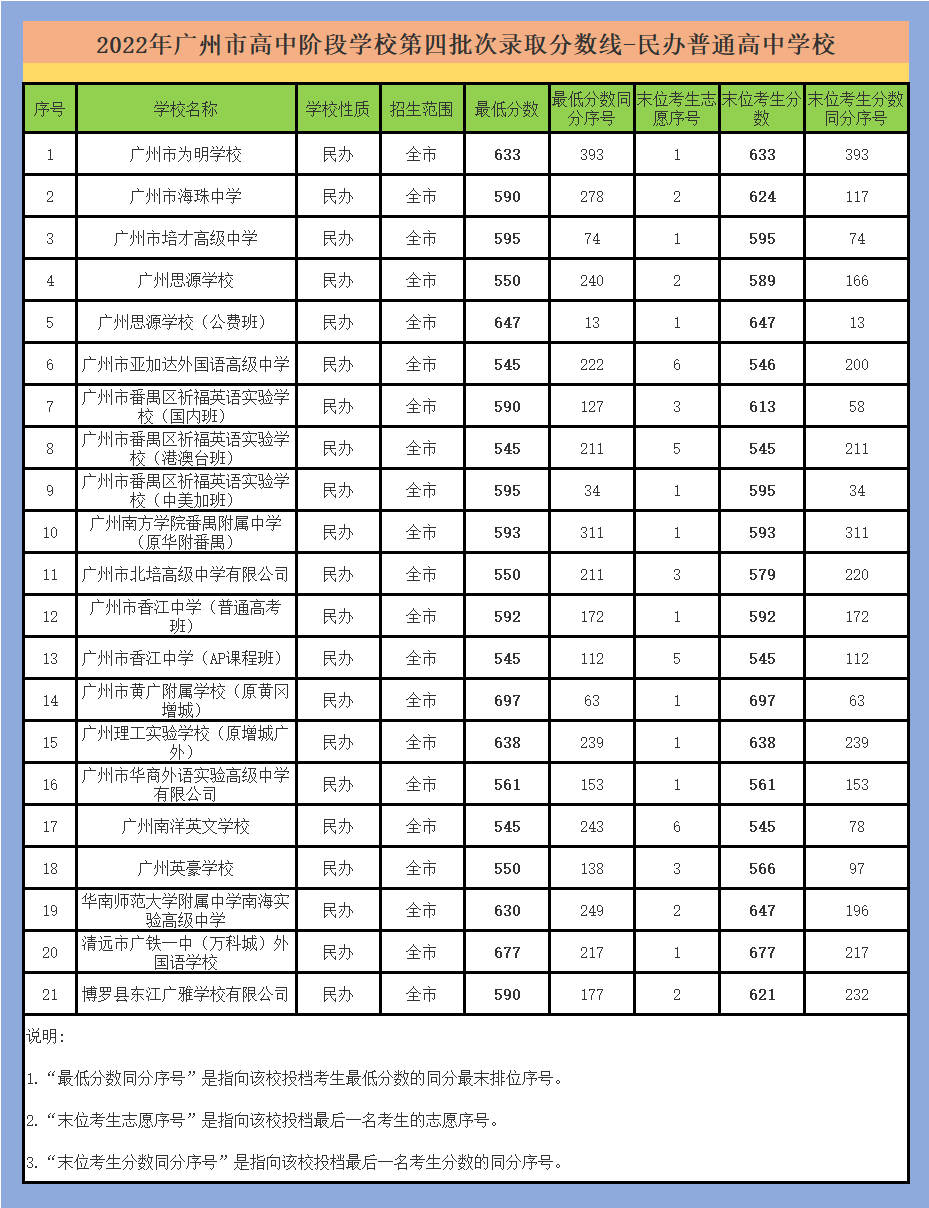 2022年广州市高中阶段学校第四批次录取分数线-民办普通高中学校