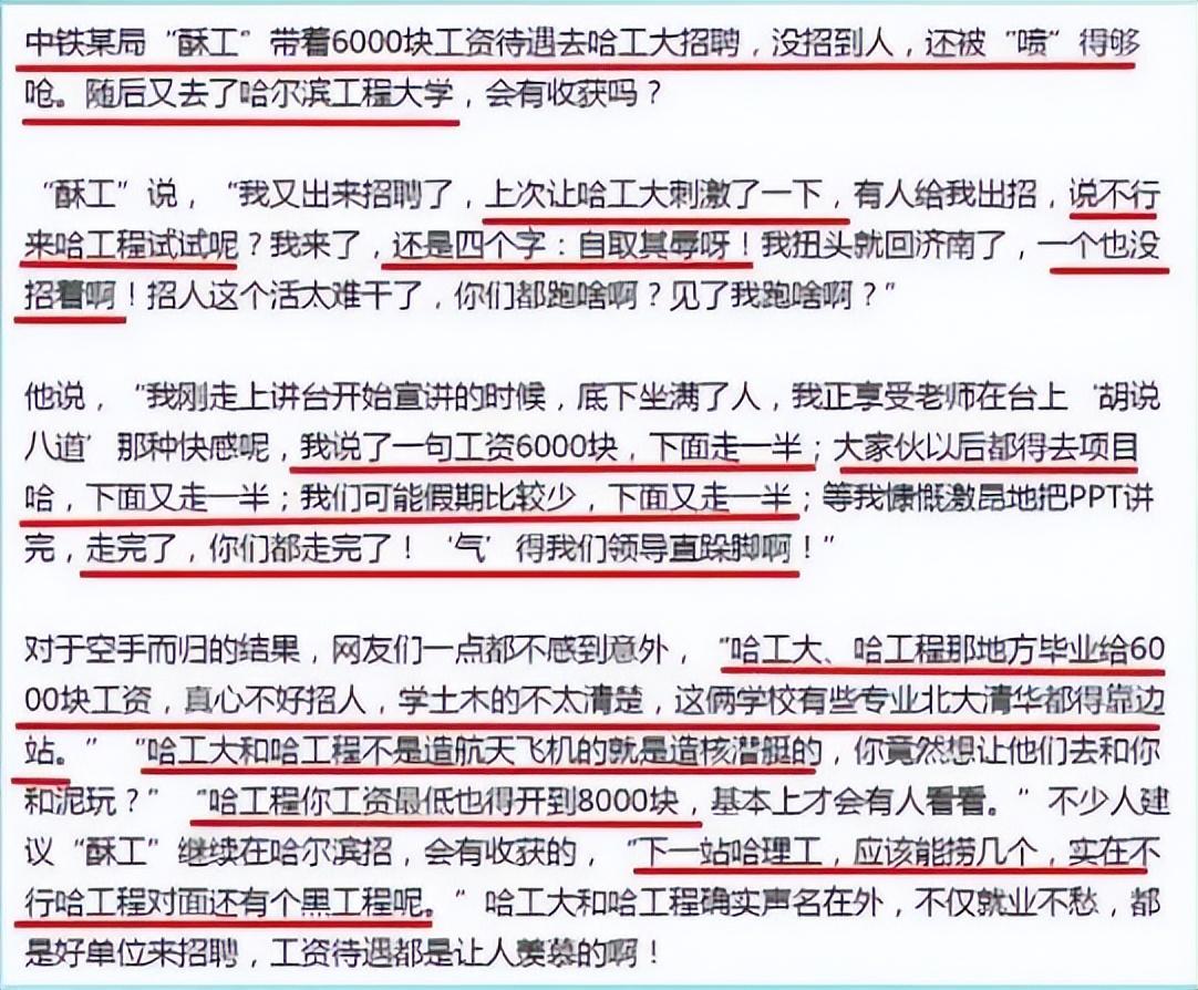 哈尔滨工业大学确实不是所有专业的就业情况都很好,在这所理工类大学里,也有许多文科类专业,实力远不如校内理工科专业,就业时薪资自然也不会很高。但是,中铁某局来招聘肯定也不是针对这些文科类专业,所以,学生不能一概而论。