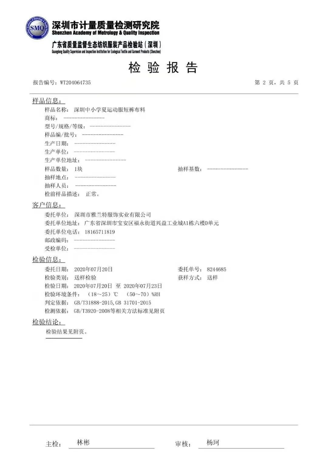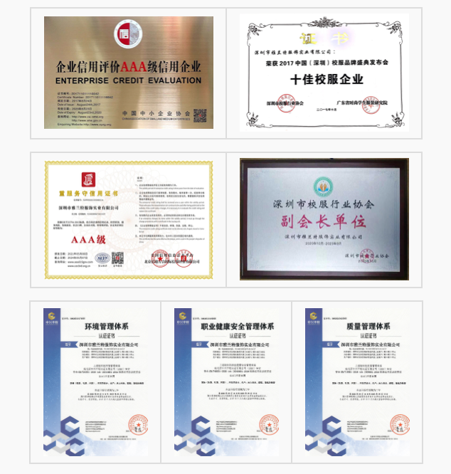 公司率先通过了ISO9001、ISO14001、OHSAS18001管理体系认证,荣获“中小企业3AAA信用等级” “广东省重合同守信用企业” “深圳市十佳校服企业” “深圳市校服行业协会会长单位” “中小企业协会会员单位” “广东省质量检验协会理事单位”等,所有校服、服装、鞋帽等都经具有国家权威检测机构的深圳市产品质量监督检验所、安全环保指标检测中心检测通过。