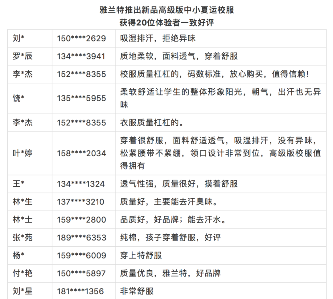 为了验证高级版校服的实用性,雅兰特还特别进行了“高级版中小夏运动款校服体验活动”,收获20位体验者一致好评。