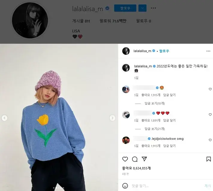 在韩国活动的艺人中,Lisa的INS粉丝数最多,达7160万人,她1月6日在INS上传的新年第一个帖子是?