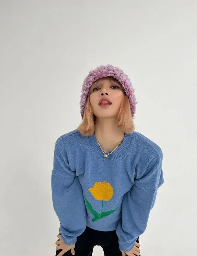 在新年问候的同时,LISA穿着黄色刺绣的蓝色毛衣和黑色运动裤,是一身既可爱又时尚的装扮。