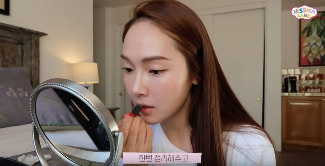 郑秀妍先用与双唇颜色相似的唇膏作为打底,涂满双唇。
