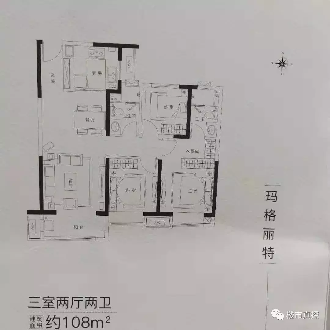 108平米以及116平米的户型几乎完全一致,只有面积大小的区分,是比较传统的紧凑型三居室,三个卧室紧邻,主卧做了比较流行的南北通透型主卫设计,除了相互之间可能有一些干扰,整个户型比较实用。