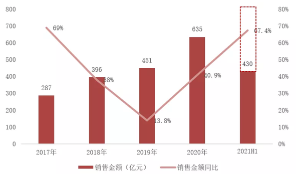 销售额方面:2019年销售额450.8亿元;2020年销售金额约635.3亿元,同比增长约40.9%;2021年销售金额约739.8亿元,同比增长16.45%,总销售面积约为349.2万平方米。