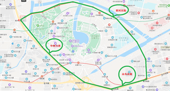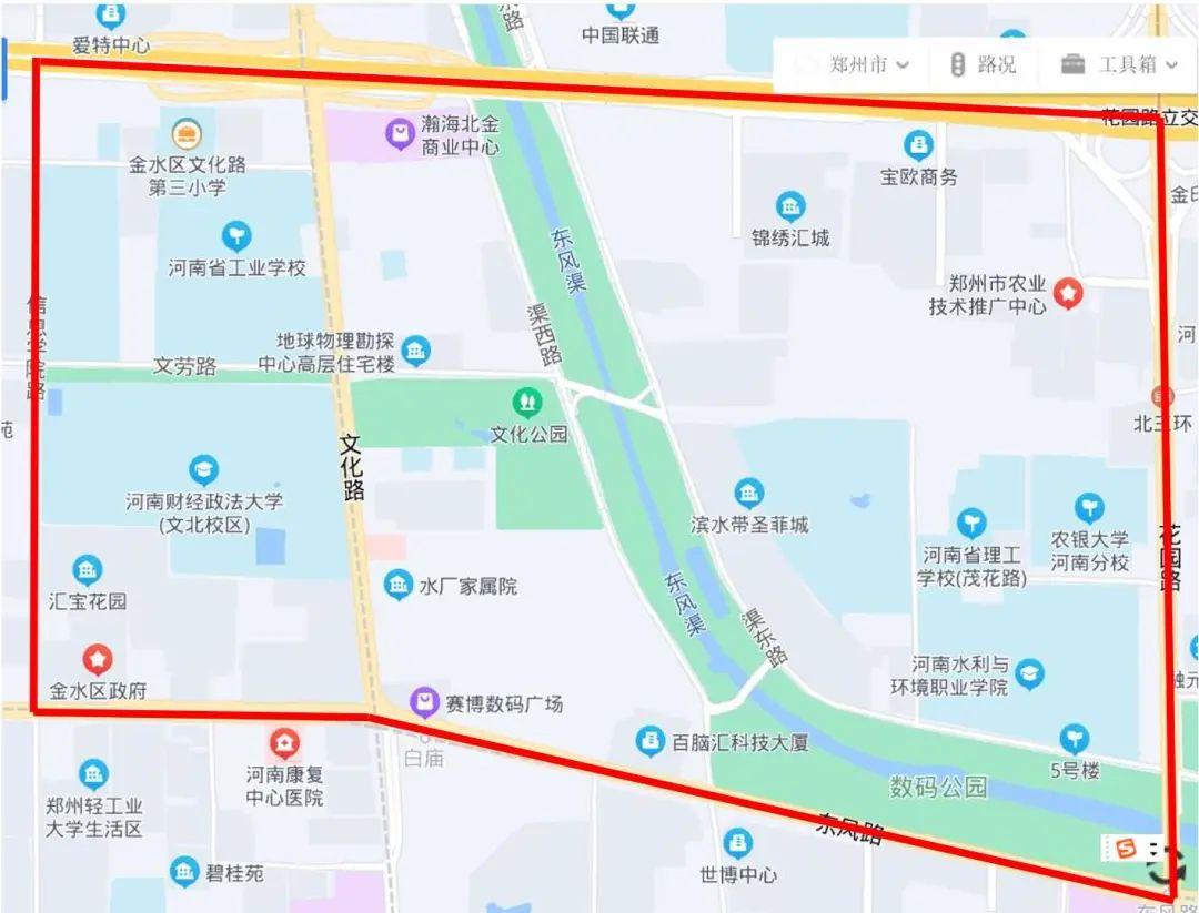 中州大道以东、黄河东路以南以西、金水东路以北区域。