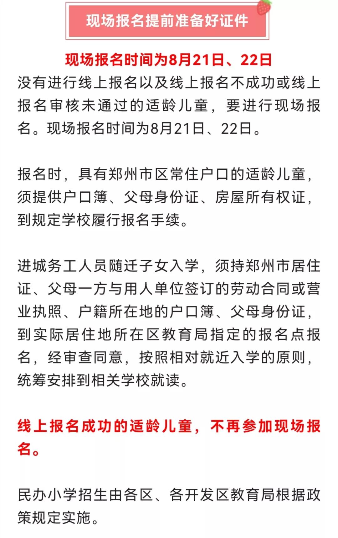 今年郑州市区小学入学现场报名时间为8月21日—8月22日。未进行线上报名以及线上报名不成功或线上报名审核未通过的适龄儿童,需进行现场报名。线上报名成功的适龄儿童,不再参加现场报名。