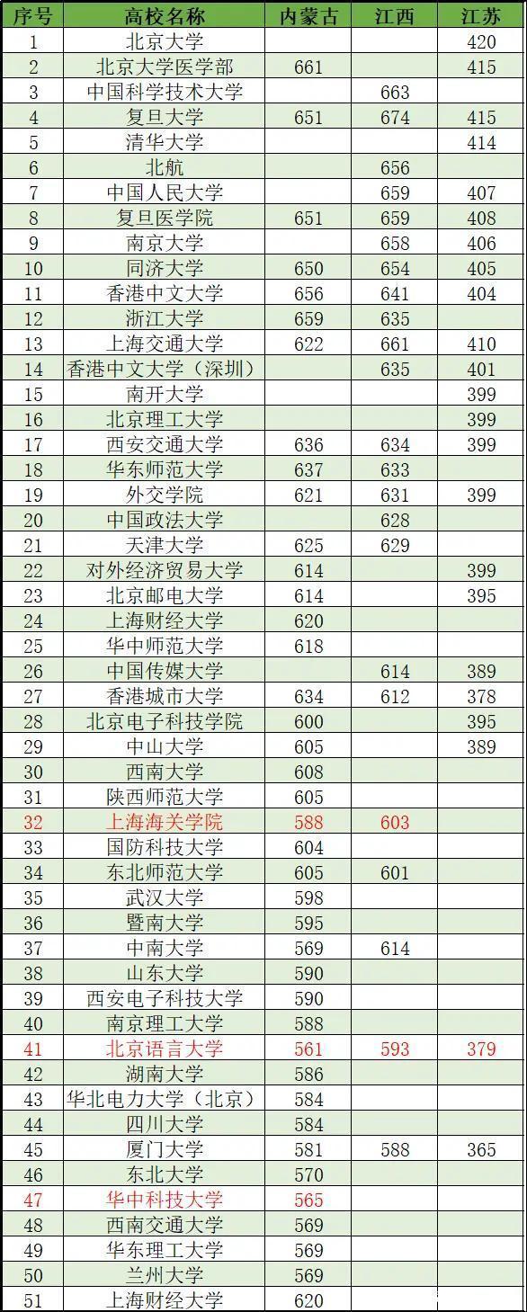 同比四非高校上海海关学院数据可就非常抢眼了,在内蒙投档线588分,在江西投档线603分。作为一所前几年还是二本招生的四非院校,投档线比厦门大学、四川大学、东北大学等985高校还要高。
