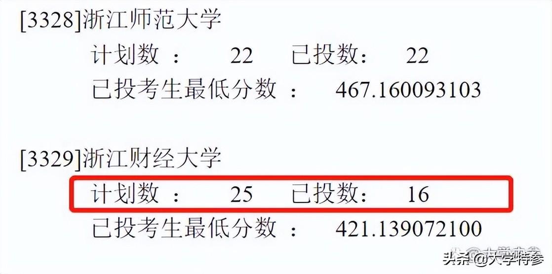 从教育部门公布的投档线来看,浙江财经大学招生计划25人,已投档人数16人,缺额9人,缺额占比近40%,也是不低。
