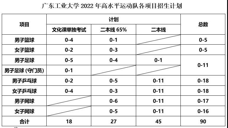 2022年我校高水平运动队招生计划严格执行教育部的有关规定,总计划不超过90名。各项目计划分配如下: