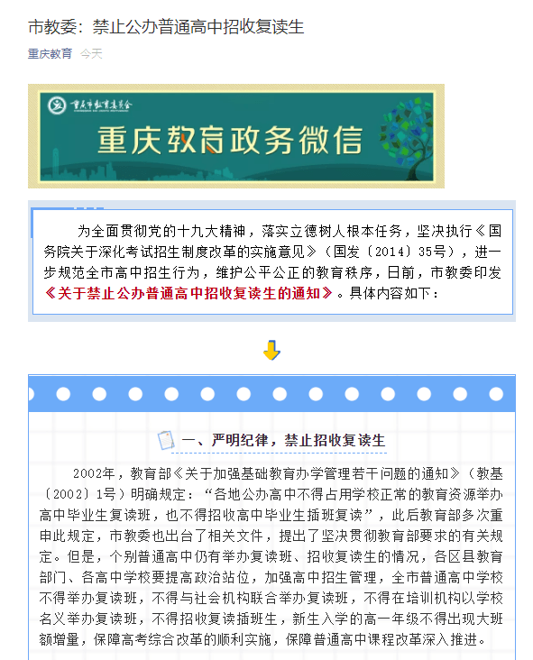 6月16日,重庆发布通知,明确规定公立高中不得举办复读班,不得与社会机构联合举办复读班,不得在培训机构以学校名义举办复读班,不得招收复读插班生。
