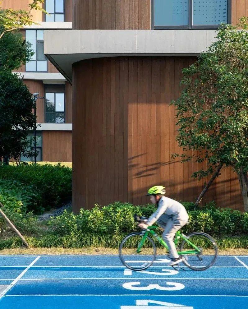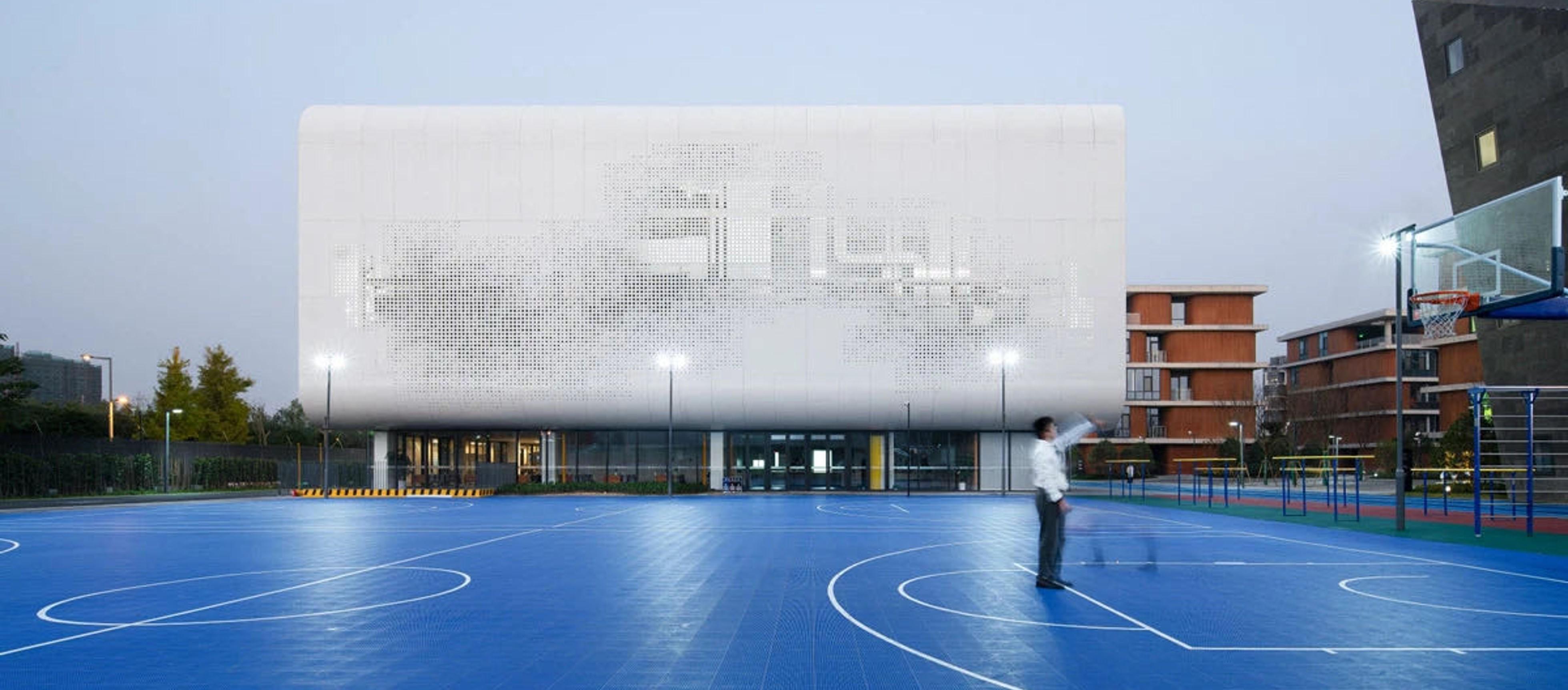 在青浦平和,跑道不止在运动场,而是环绕了整个校园,就像穿流而过的古运河。游泳池和体育馆像两个白色的气泡飘浮在食堂透明的玻璃盒子上方。夜幕降临时,室内的律动的光线透过体育馆外墙的气孔时隐时现,仿佛孩子遨游在夜空里绵绵的白云上。