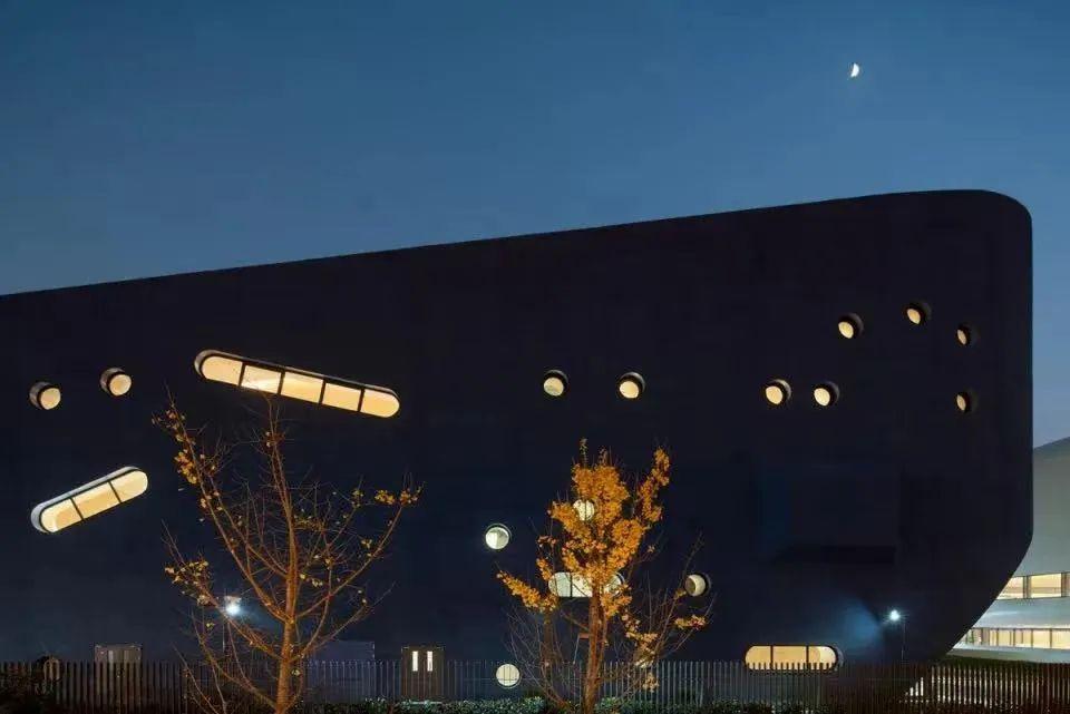 初遇图书馆,很难不被它奇幻的外观所吸引。从远处就可以看到它醒目的蓝,一个个有机形态的天窗、舷窗和圆洞,组合成生动的表情,将这个学校的天真与童趣引入城市界面。有的学生说,图书馆仿佛一所“太空舱”;有的学生说,图书馆好像一块蓝色的奶酪;夜空中,它仿佛一只巨大的蓝鲸遨游在星河……