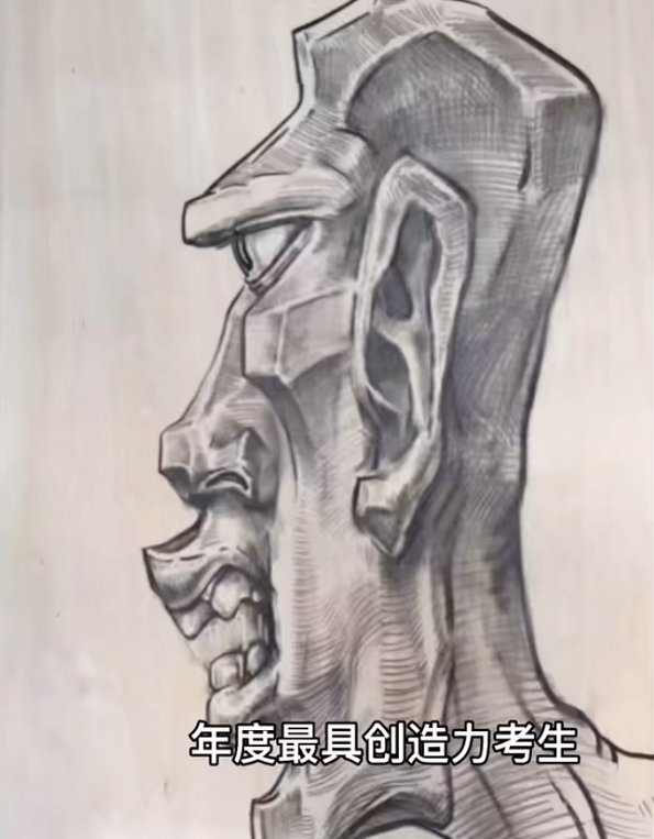 这是年度最具创造力的学生,他在艺考的考场上画出这样的作品,真的是非常的吸睛,很多非美术行业人士可能不知道,美术生阅卷跟文化课生不一样,美术生是将所有学生的画纸铺在 大厅里面,跳出最吸引眼球并且画工好的作品,一次分等级,判定分数。