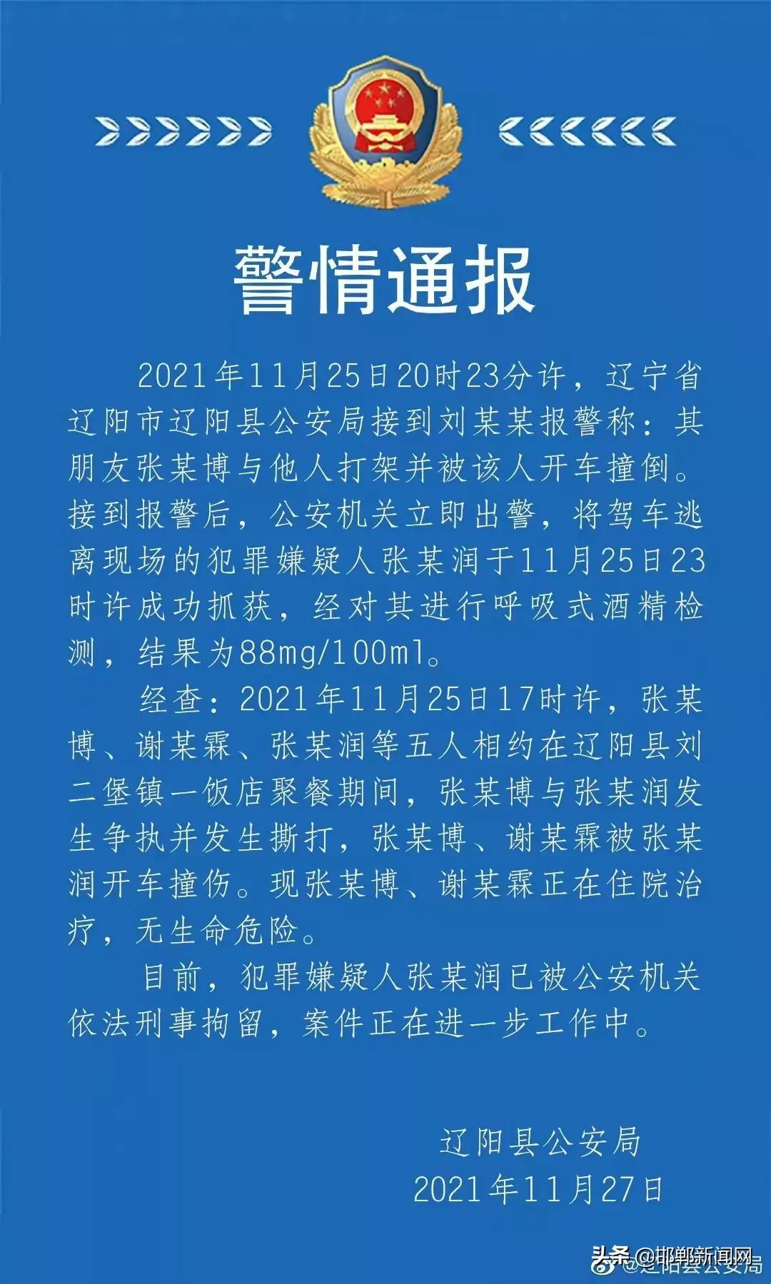 11月25日晚,辽宁辽阳县刘二堡镇一超市门口,一辆跑车将一名男子撞飞后逃逸。27日下午,辽阳县公安局发布警情通报称,系五人聚餐时,两人发生争执和撕打,此后一人开车将另两人撞伤,开车者涉嫌醉驾已被刑拘。