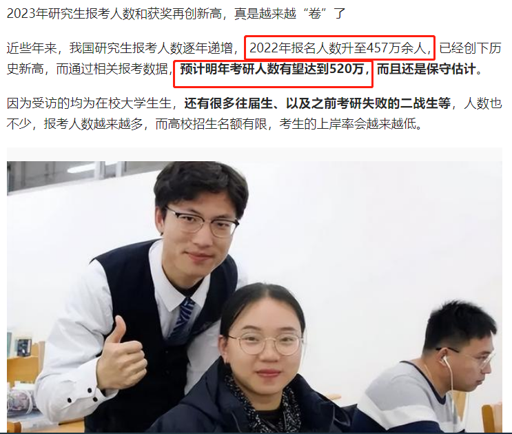 现在的大学生毕业后,基本都会选择读研。据统计,2022年的研究生报考人数达到457万,而明年预计将达到520万人。