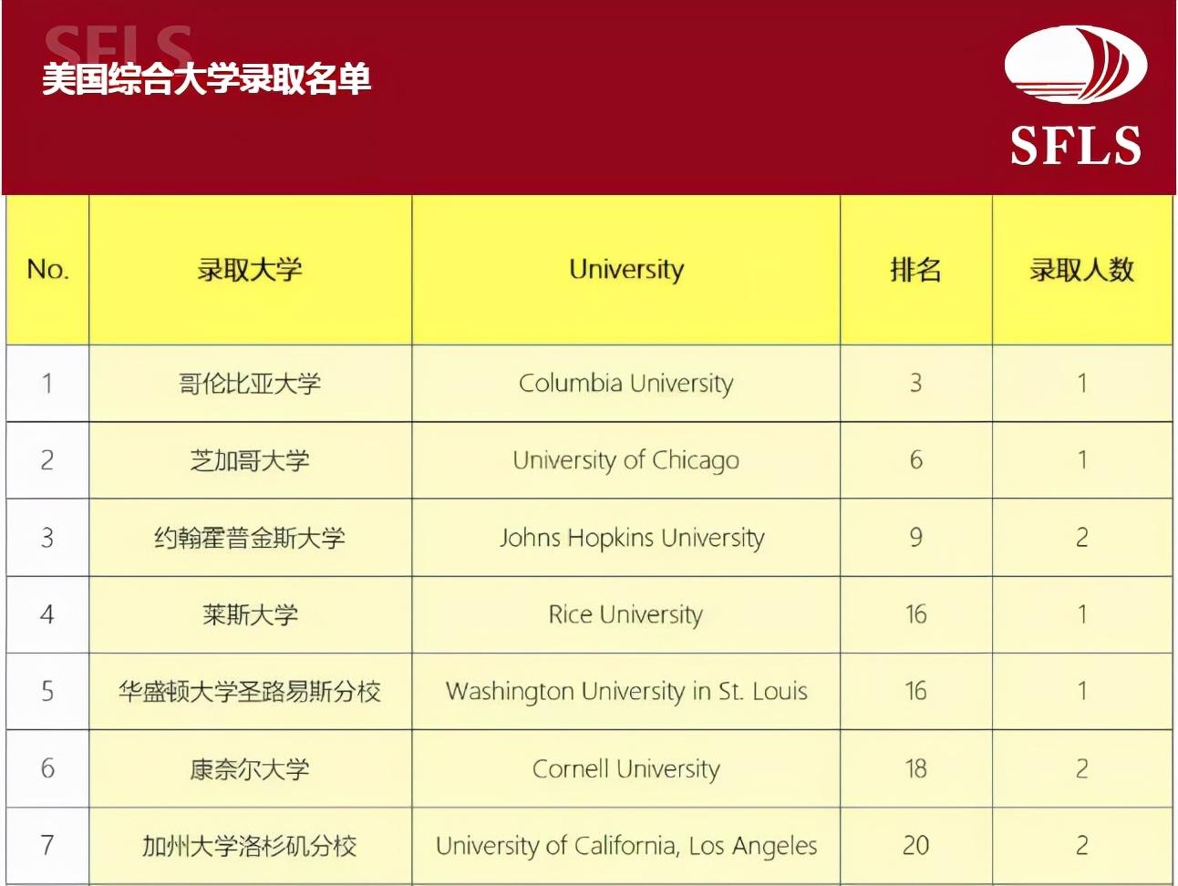 其中,获得芝加哥大学录取1封、西北大学1封、约翰霍普金斯大学1封、杜克大学2封、达特茅斯学院1封、范德堡大学2封、华盛顿大学圣路易斯2封、康奈尔大学2封、加州大学洛杉矶分校5封、埃默里大学3封、加州大学伯克利分校7封、帝国理工学院2封、伦敦大学学院4封、多伦多大学7封。