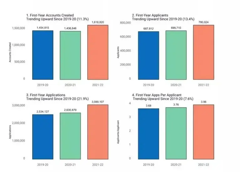 但是今年的申请人数不降反升,可见在疫情缓解之后,人们依旧希望去美国留学深造。今年的国际生申请人数达到62,291人,与2019-20申请季相比增长40%。