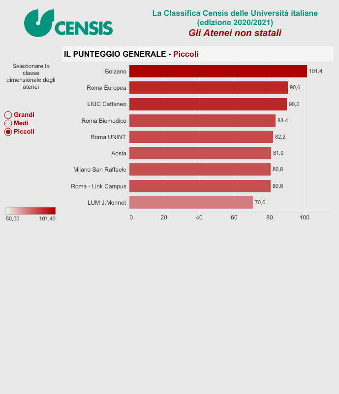 在小型规模(5,000名以下)且数量最多的众多院校中,博尔扎诺自由大学继续名列第一(总得分为101.4),其次是罗马欧洲大学(90.6分)排名第二,LIUC Università Cattaneo(90.0分),下降到了第三位。 Lum Jean Monnet大学排名倒数第一,倒数第二是Rome Link大学。