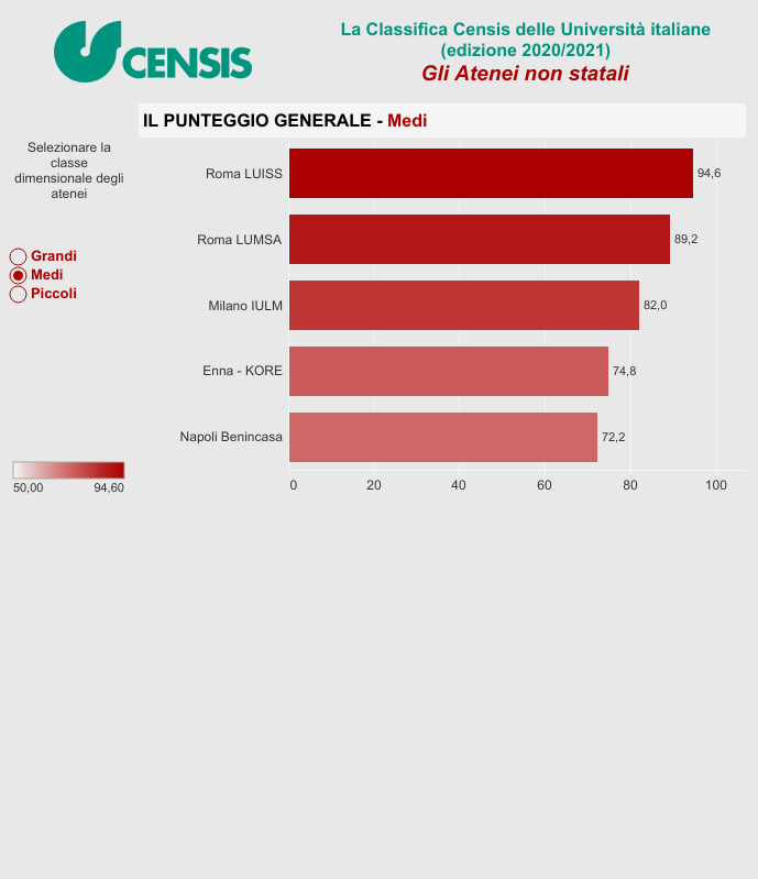 在中型院校(5,000至10,000名)中,今年Luiss大学排名第一,得分为94.6,其次是Lumsa(89.2分),而Iulm(82.0分)继续排名第三。