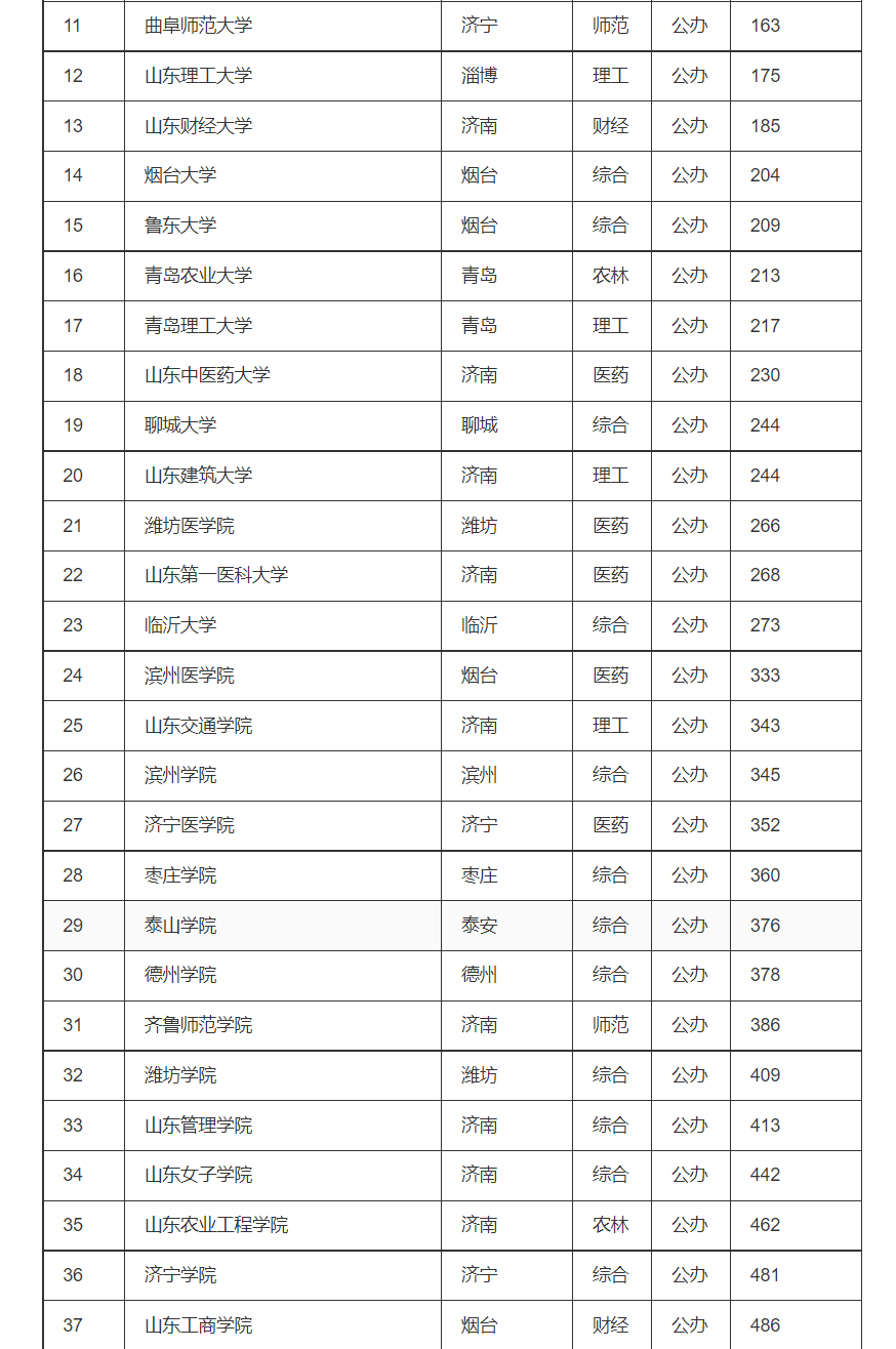 十一曲阜师范大学,十二山东理工大学,十三山东财经大学,十四烟台大学,十五鲁东大学,十六青岛农业大学,十七青岛理工大学,十八山东中医药大学,十九聊城大学,二十山东建筑大学,二十一潍坊医学院,二十二山东第一医科大学,二十三临沂大学,二十四滨州医学院,二十五山东交通学院,二十六滨州学院,二十七济宁医学,二十八枣庄学院,二十九泰山学院,三十,德州学院。