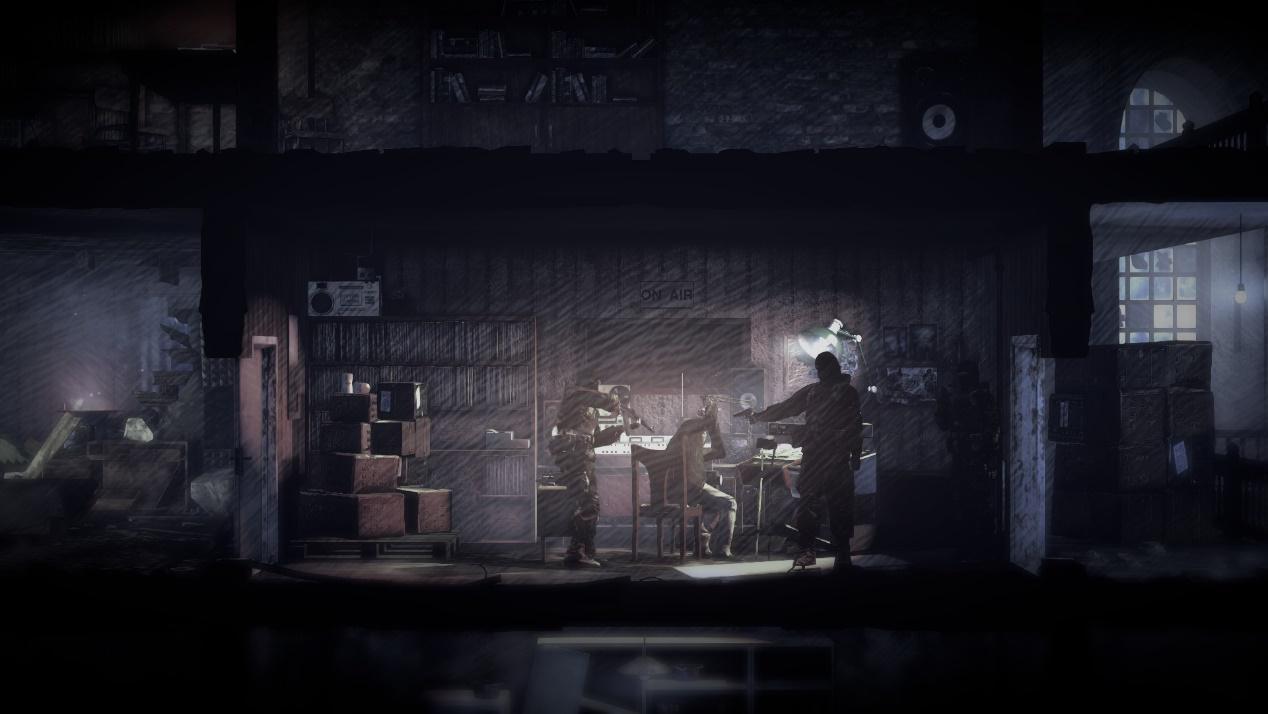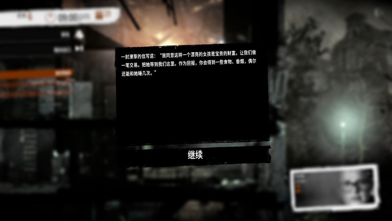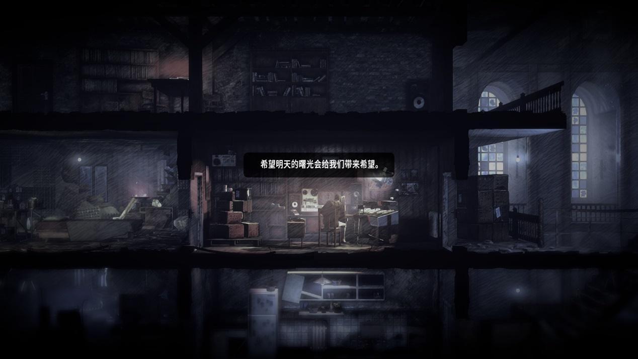 战争并不只包含正面战场,受其波及更多的便是平民。相信读者对游戏中的经典模式影响深刻,例如寂静小屋下相依为命的一对老夫妻,被士兵威胁的女孩,还是被逃兵活活饿死的男人。玩家需要通过多样的对话、字条等细节感受身处战争下的平民。但总体来说这些剧情是可以进行规避,而本期着重于《这是我的战争》第二个剧情DLC最后的广播中带给笔者震撼的桥段。