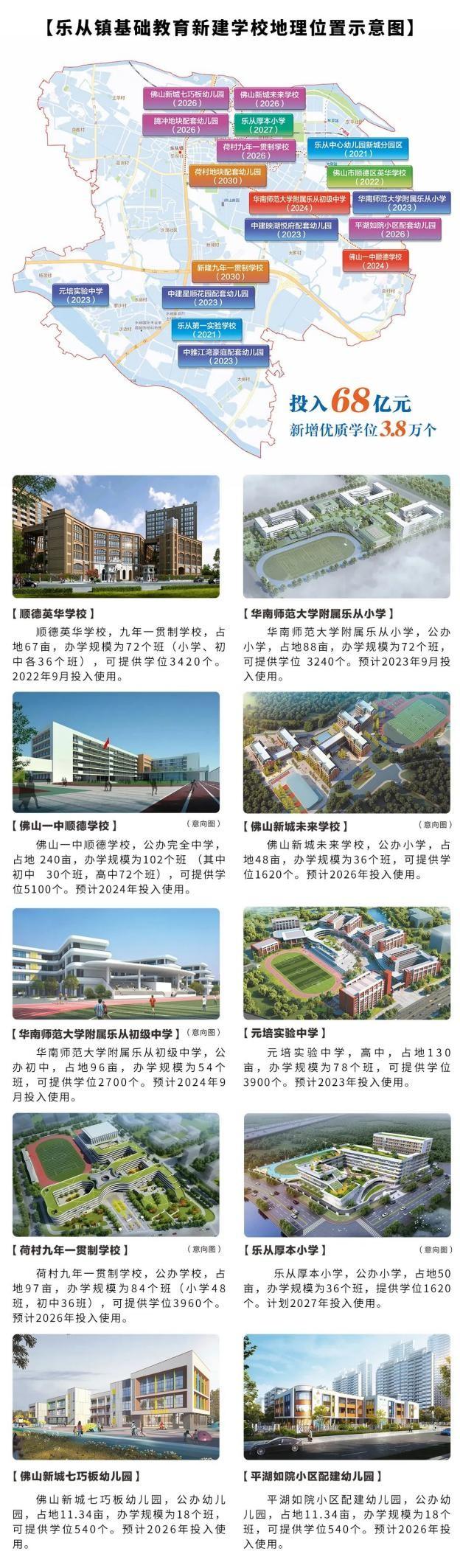 华南师范大学附属乐从初级中学,公办初中,占地96亩,办学规模为54个班,可提供学位2700个。预计2024年9月投入使用。