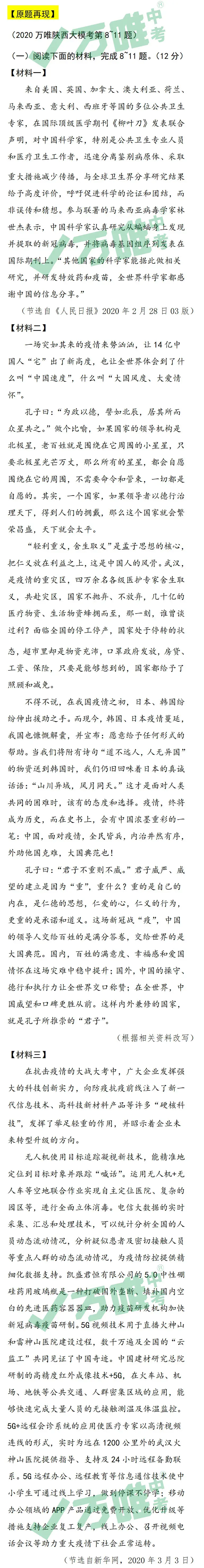 3月15日,19300名陕西中考生参加了万唯中考“2020语文线上大模考”。在疫情停课期间,这次公益性模考,及时有效地帮助了一线老师了解学生本阶段复习的情况,为后期的复习备考提供参考,模考后师生好评连连。