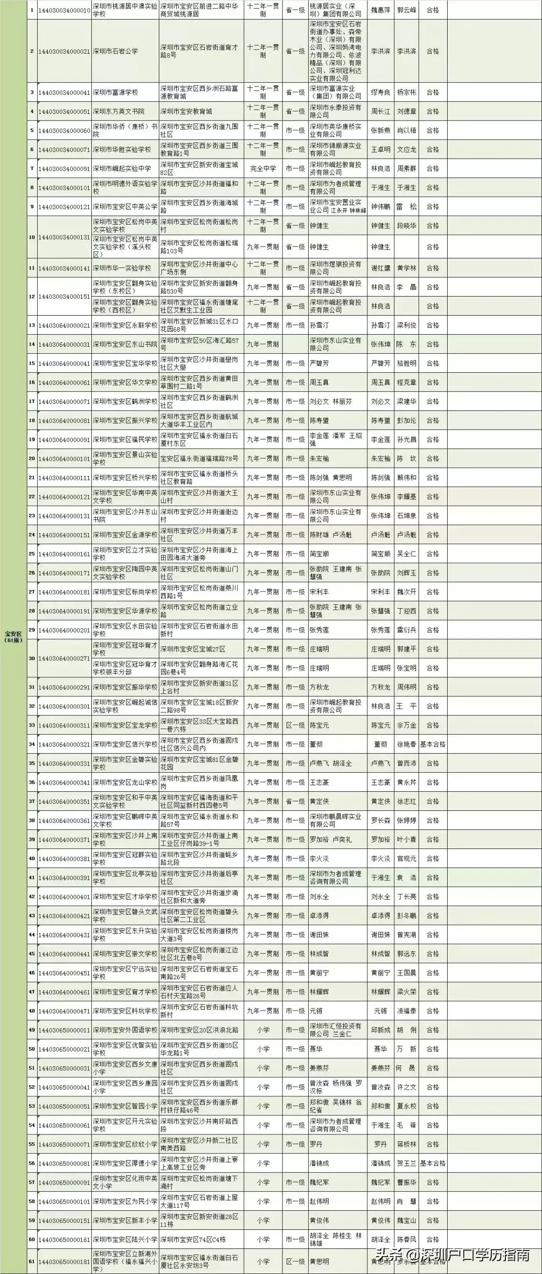 宝安区:共61所。其中深圳市宝安区松岗中英文实验学校、深圳市宝安区翻身实验学校、深圳市宝安区冠华育才学校有2个校区,分校区统计:十二年一贯制11所,九年一贯制39所,小学13所,完全中学1所。