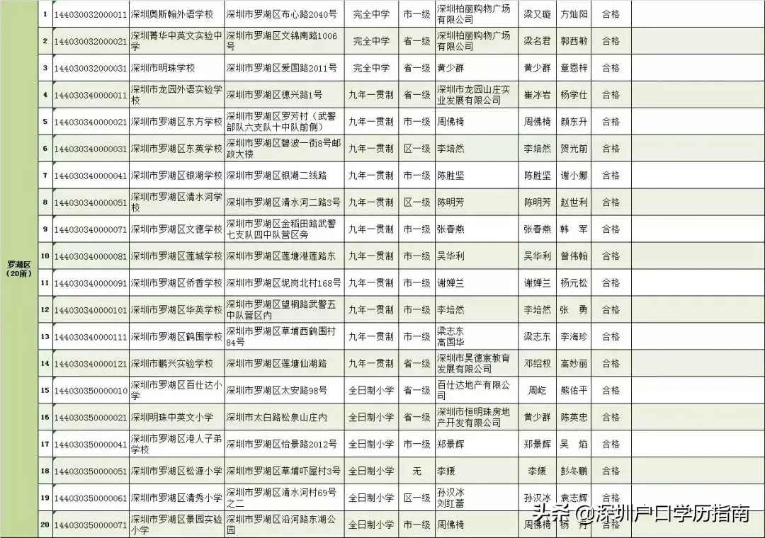 罗湖区:共20所。完全中学3所,九年一贯制11所,全日制小学6所。