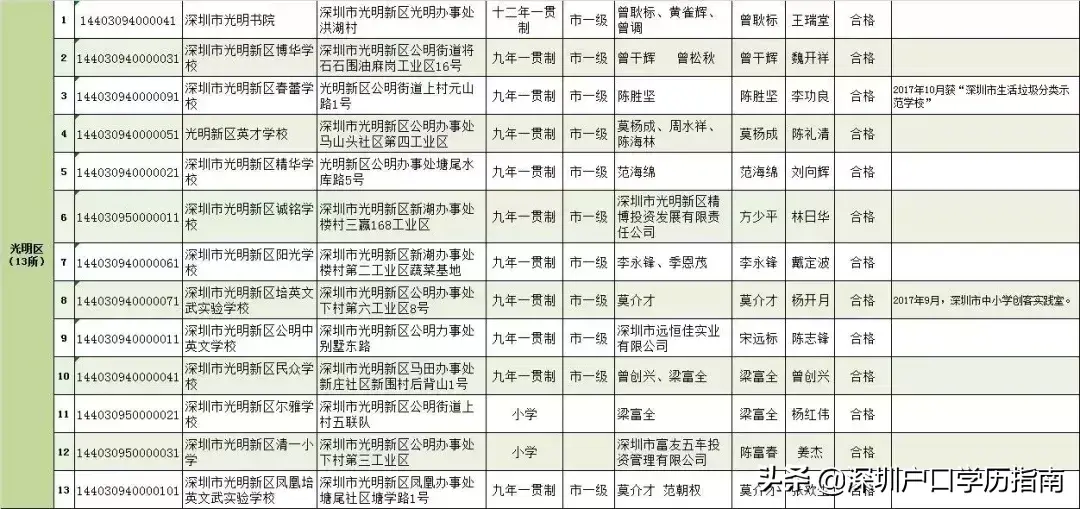 光明区:共13所。十二年一贯制1所,九年一贯制10所,小学2所。