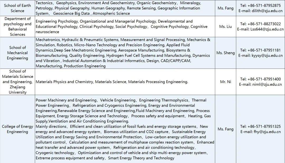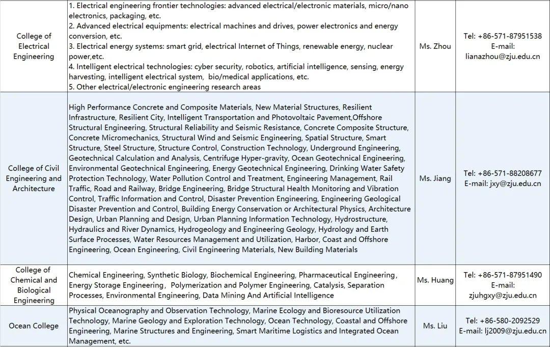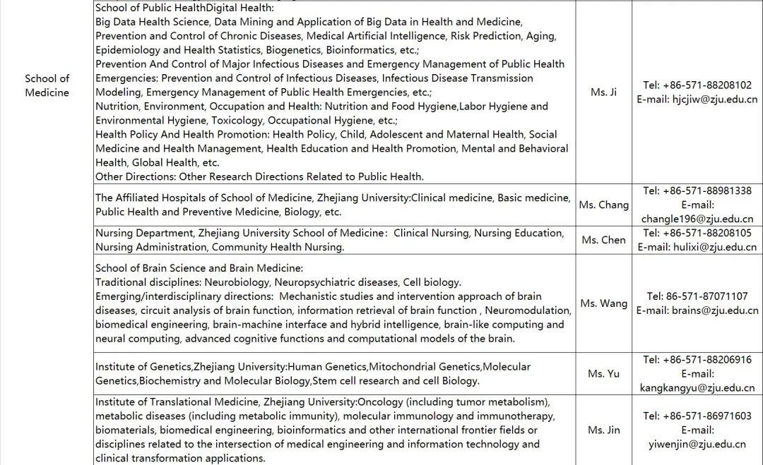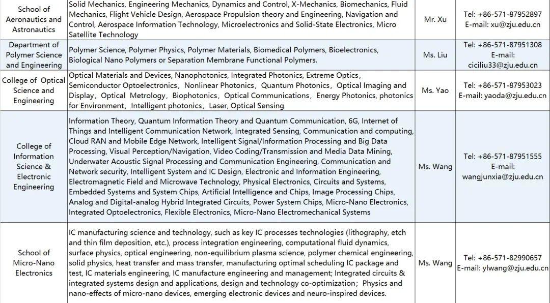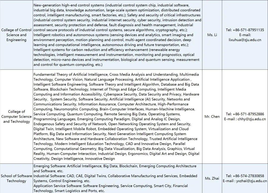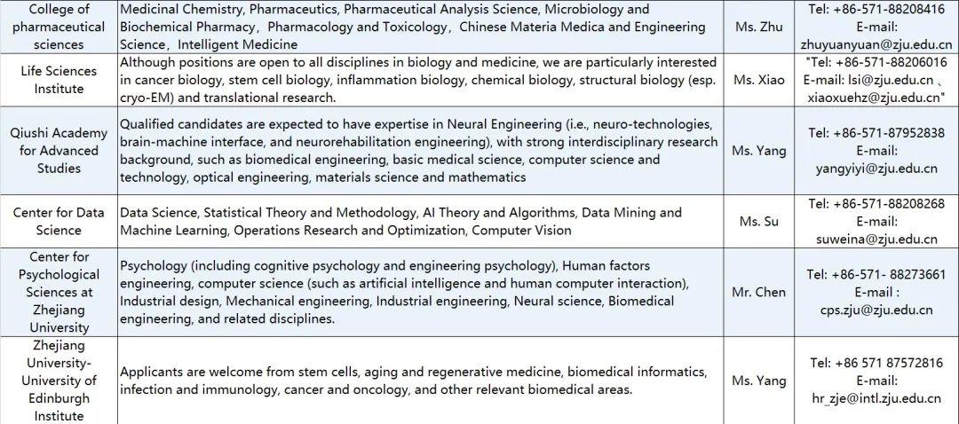 All the materials needed for application should be integrated into a PDF document named “name—department/school—research direction—talent category ”, and sent to the email of the respective contact of the department/school (see the attached table for details) that you are applying for, copied to the email of zju-hr@zju.edu.cn. Postdoctoral researchers can send directly to the email of the respective contact of the department/school.