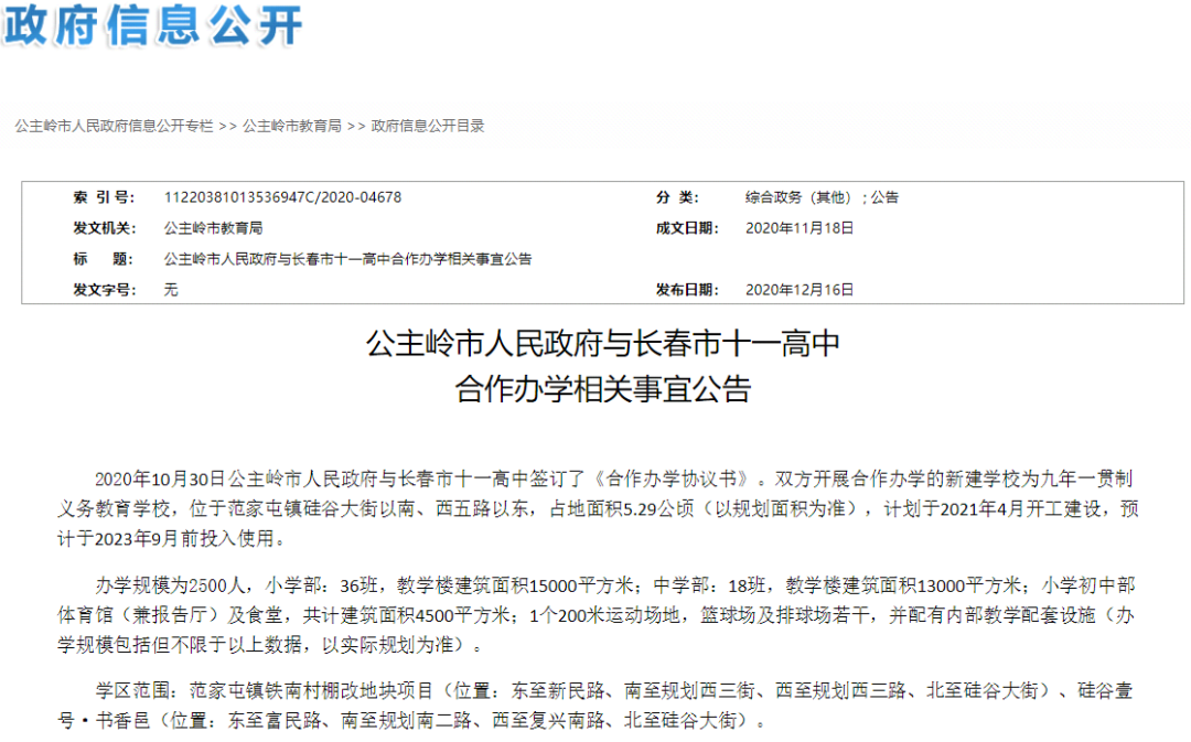 12月16日公主岭市政府官网公布了和十一高合作办学的相关事宜,明确了将新建一所九年一贯制学校。
