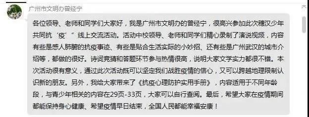 活动中,所有同学们都收到了来自广州市文明办的一份特别的礼物——《抗疫心理防护实用手册》。广州市文明办的曾经宁介绍,这本书的内容适用于不同年龄段的人群,与青少年相关的内容在29页-33页。电子书一经发出,老师、孩子们纷纷点赞!