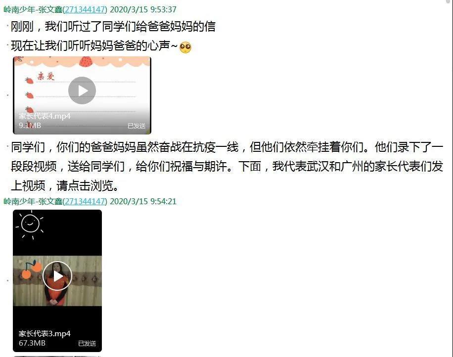 在今年的新冠肺炎阻击战中,我们身边有着许多“逆行者”,他们是医生、是护士、是各行各业的志愿者,他们为我们撑起了保护的屏障,他们的精神鼓舞着我们。 在“穗汉少年心连心 守望相助战疫情”武汉市江岸区汉铁小学、广州市越秀区铁一小学两校交流活动中,武汉市江岸区汉铁小学、广州市越秀区铁一小学的同学写了一些心里话,拍了一些视频,给正奋战在抗议一线的亲人们,表达了他们的牵挂,也给他们加油打气。而他们的爸爸妈妈尽管奋战在抗疫一线,但他们依然牵挂着你们。他们录下了一段段视频,给孩子们送去祝福与期许。