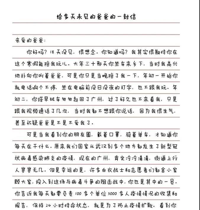 亲子齐抗“疫” 广州市八一实验学校的杨欣达同学的妈妈是一位交警。疫情期间,她放弃了休假,负责信息收集报送、突发事件应对等,为抗“疫”提供了有力支持。