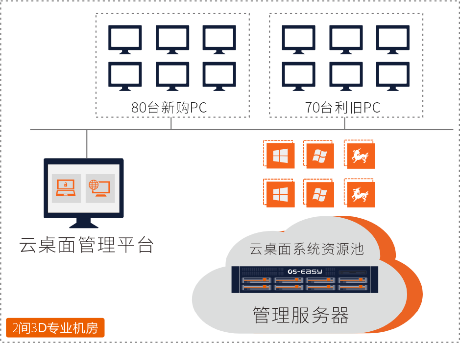 2间专业机房利旧70台终端,新购80台终端,通过单一的融合管理平台,以智能PNP驱动技术,将新旧不同批次、不同配置、不同型号的异构终端进行统一管控,真正实现资源高效利用与统一运维管理的建设需求。