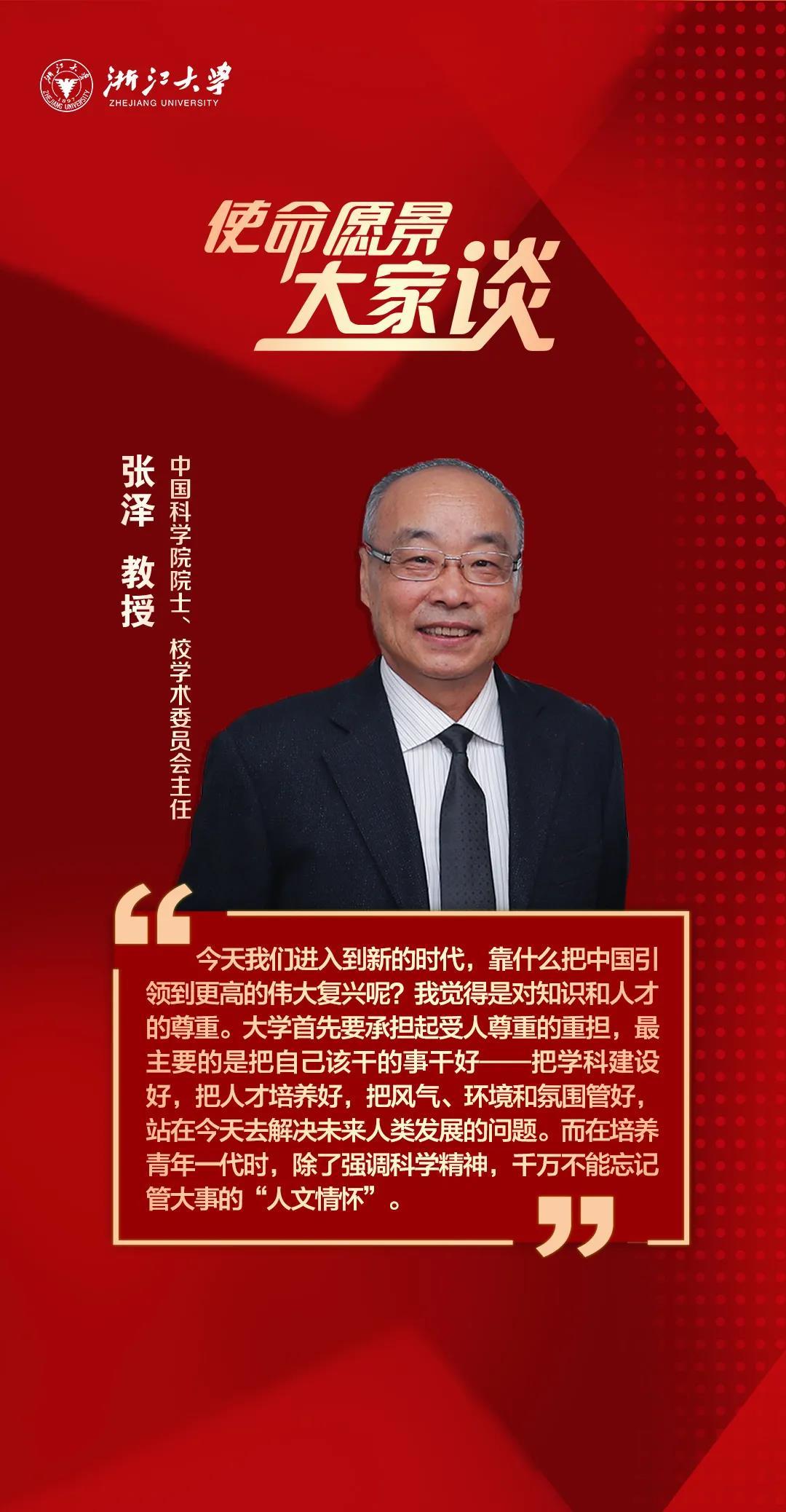 新征程勇担新使命,大讨论汇聚大愿景。立足“两个大局”,胸怀“国之大者”,面向全面建成社会主义现代化强国的第二个百年奋斗目标,浙江大学在全校范围内开展新发展阶段使命愿景大讨论。学校开辟“使命愿景大家谈”专栏,邀请专家学者畅谈他们心目中的使命愿景,在大讨论中进一步着眼未来、观照现实,将使命愿景转化为实际行动。本期邀请到中国科学院院士、浙江大学学术委员会主任张泽教授,中国科学院院士、浙江大学建筑工程学院陈云敏教授,中国工程院院士、浙江大学化学工程与生物工程学院任其龙教授。